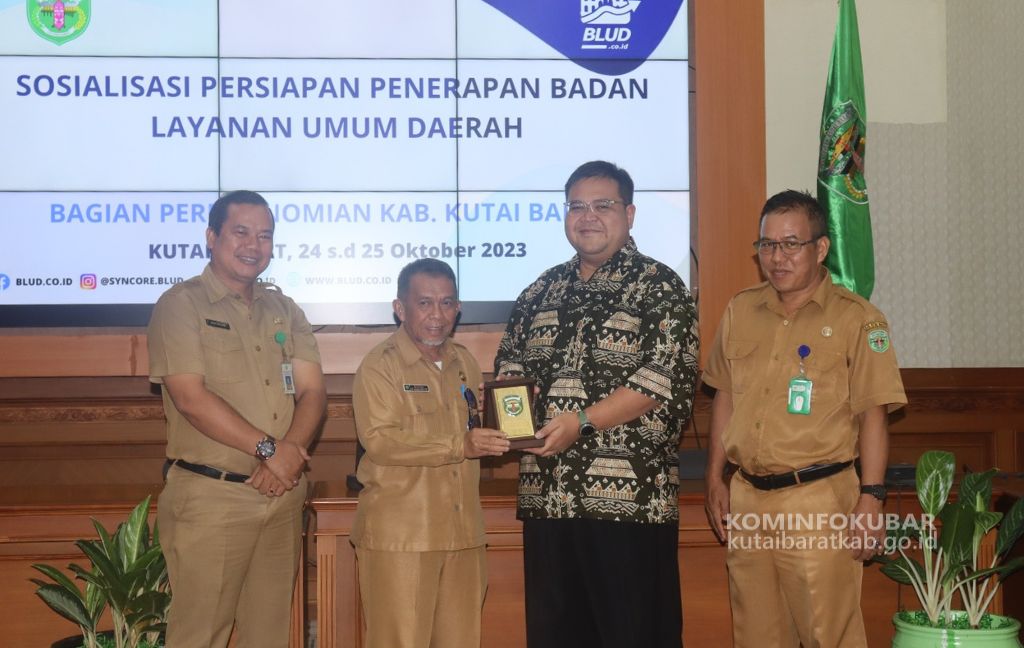 Asisten II Rakhmat Menyerahkan Cinderamata Kepada Niza Wibyana Tito Dari Syncore Lembaga Konsultan Keuangan Yogyakarta Pada Pembukaan Sosialiasi Pra Implementasi Pembentukan Badan Layanan Umum Daerah (BLUD) Puskesmas Kabupaten Kutai Barat. Ruang Diklat, Sekretariat Daerah Kabupaten Kutai Barat, Sendawar. Selasa (24/10/2023). Foto : Dita.