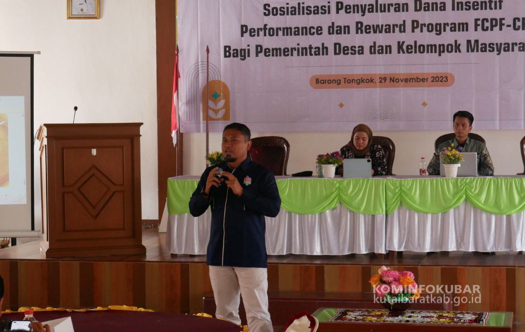 KOMINFOKUBAR-BARONG TONGKOK. Dalam rangka mendukung keberlanjutan hutan dan pengurangan emisi karbon, Biro Perekonomian Sekretariat Provinsi Kalimantan Timur menggelar Sosialisasi Penyaluran Dana Insentif Performance dan Reward Program FCPF-CF bagi Pemerintah Desa dan Kelompok Masyarakat. Berlangsung di Ballroom Hotel Grand Family, Kec. Barong Tongkok.Rabu (29/11/23).