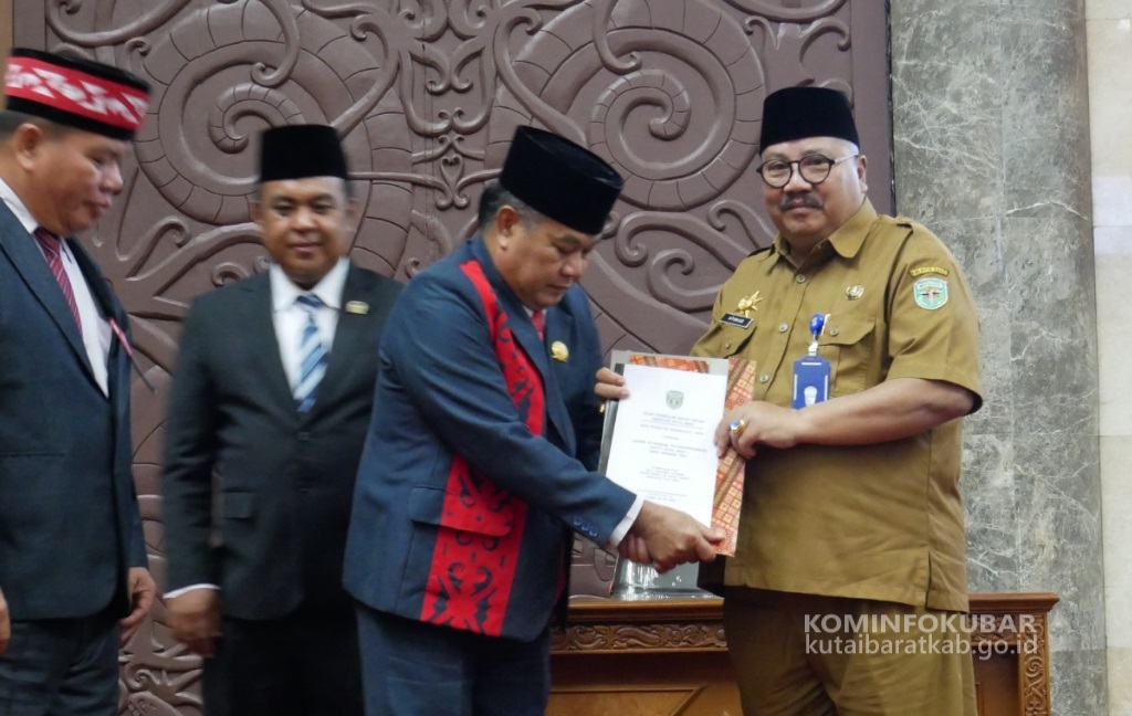 Sekretaris Daerah Ayonius Menerima Dokumen rekomendasi dari Ketua DPRD Kutai Barat Ridwai terhadap LKPJ Kepala Daerah TA 2023. Ruang Sidang Utama, Sekretariat DPRD Kutai Barat, Sendawar. Senin (06/05/2024). Foto : Dita.