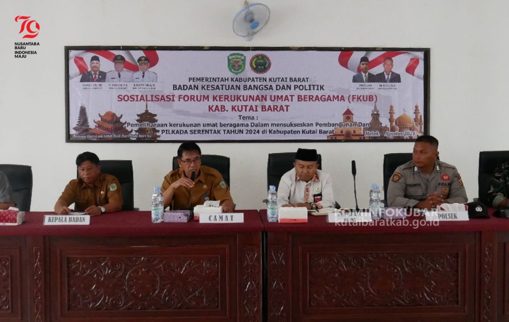 KOMINFOKUBAR-MELAK. Untuk meningkatkan peran tokoh agama dalam menjaga kerukunan umat beragama. Demi menyukseskan pemilu serentak pemilihan kepala daerah di Kutai Barat. Badan Kesatuan Bangsa dan Politik Kutai Barat menggelar sosialisasi Forum Kerukunan Umat Beragama (FKUB) di Ruang Rapat Kantor Camat Melak, Kec. Melak, Selasa (06/08/2024).