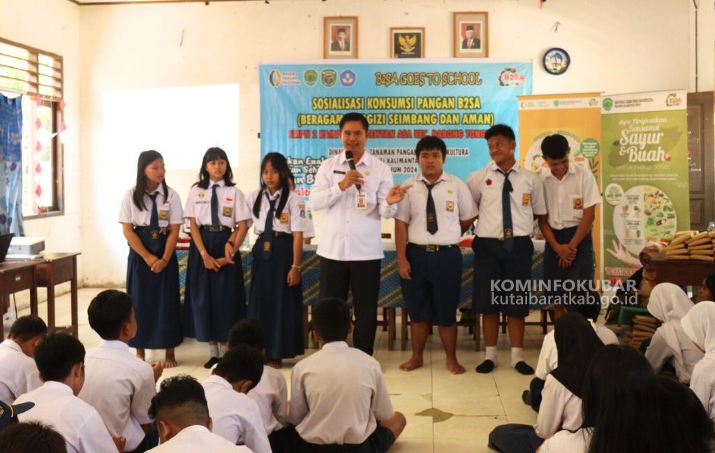 KOMINFOKUBAR-SENDAWAR. Dinas Ketahanan Pangan Kutai Barat mengedukasi siswa SMP Negeri 002 Nyenyan Asa Kecamatan Barong Tongkok dalam rangka meningkatkan pemahaman dan kesadaran untuk membentuk kebiasaan makan sehat dan baik sejak dini akan pentingnya konsumsi pangan Beragam, Bergizi Seimbang dan Aman (B2SA) di kalangan siswa dalam kegiatan B2SA Goes To School, Rabu (11/09/24).