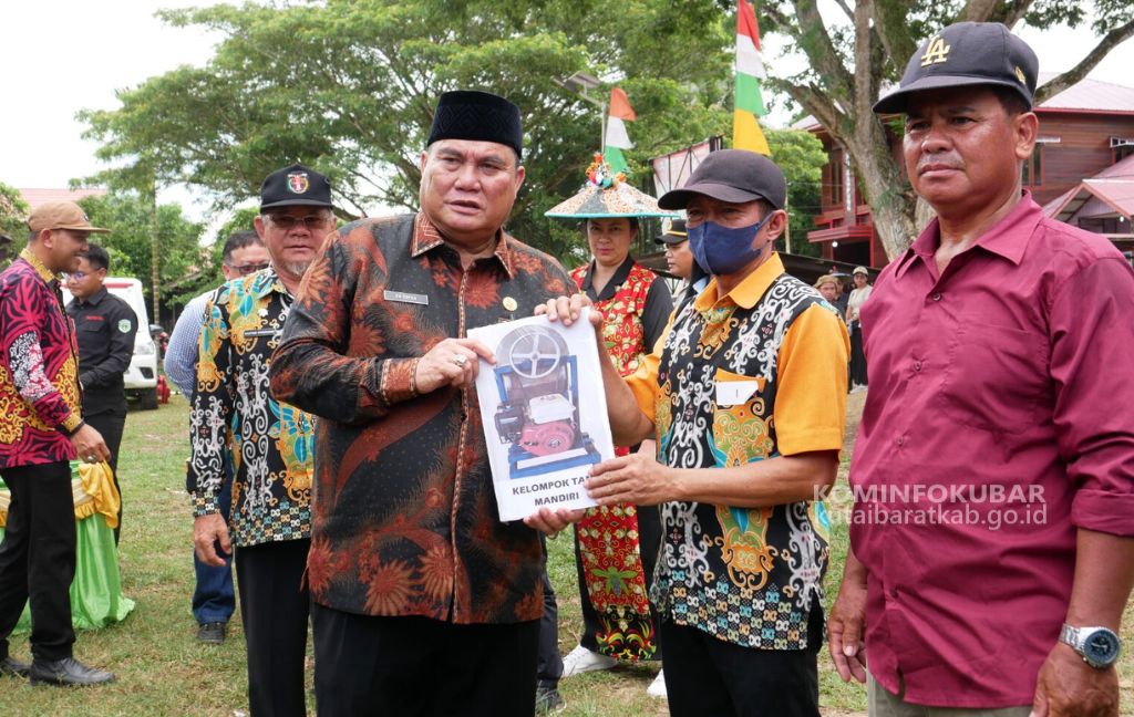 Bupati Kutai Barat, FX. Yapan Menyerahkan Bantuan Alat Mesin Sawut Pada Kelompok Tani Saat Kunjungan Kerja Di Kecamatan Muara Lawa. Jumat (11/10/2024).