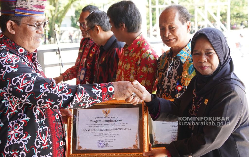 KOMINFOKUBAR-SENDAWAR. Dalam momen peringatan Hari Ulang Tahun (HUT) ke-25 Kabupaten Kutai Barat. Dinas Komunikasi dan Informatika (Diskominfo) Kutai Barat menerima penghargaan atas Akuntabilitas Kinerja Tahun 2024. Penghargaan diterima oleh Sekretaris Dinas Aspiah Nur di Alun Alun Itho, Sendawar, Selasa (05/11/2024). Penghargaan ini diberikan sebagai pengakuan atas dedikasi dan kinerja yang baik dalam pelayanan publik serta transparansi informasi kepada masyarakat.