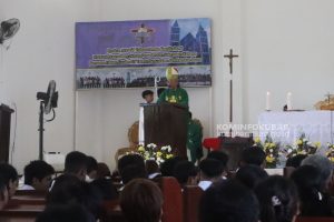 Uskup Agung Samarinda, Mgr. Yustinus Harjosusanto Menyampaikan Homili Pada Misa Di Gereja Katolik Stasi Rabuni Muara Bunyut. Sabtu (05/10/2024). Foto : Lilis KOMINFOKUBAR-MELAK. Peringati Ulang…