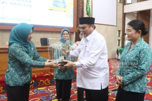 Bupati Kutai Barat, FX. Yapan Didampingi Ketua TP-PKK Kutai Barat, Yayuk Seri Rahayu Memberikan Cinderamata Kepada Pj. Ketua TP-PKK Prov. Kalimantan Timur dr. Yulia Zubir…